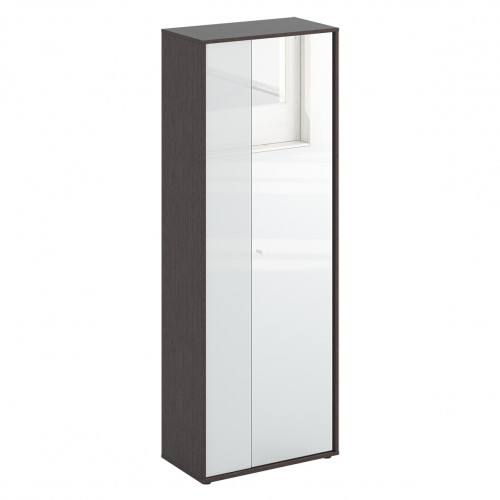 Шкаф двухстворчатый. Наполнение шкафа: выдвижная штанга для одежды и две полки. Узкая дверь декорирована окрашенным стеклом, на широкую дверь – наклеено зеркало. Двери можно менять местами. Шкаф крепится к стене.