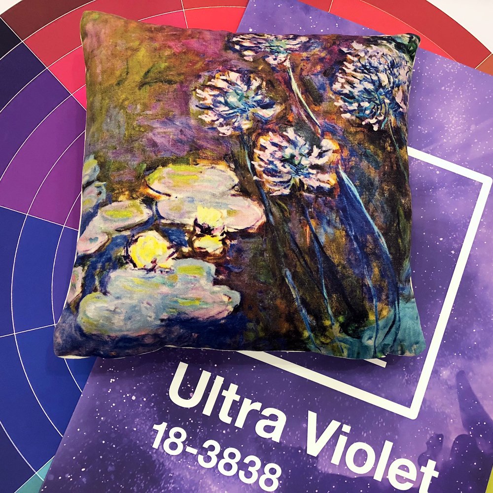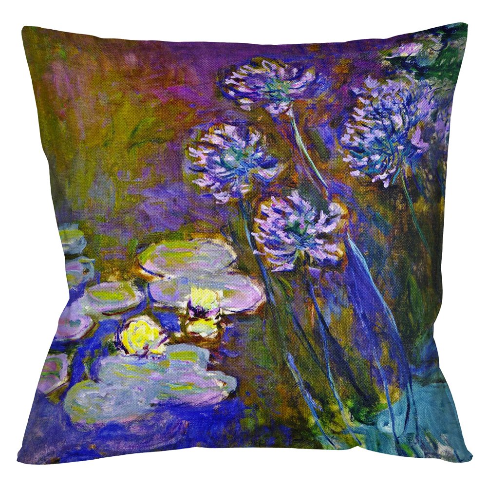 Импрессионизм разделяет с интерьером виртуозное владение цветом, красочную радость бытия, сочность и свежесть. Подушка раскрашена водным пейзажем, сошедшим с картины Клода Моне «Водяные лилии и агапантус».
