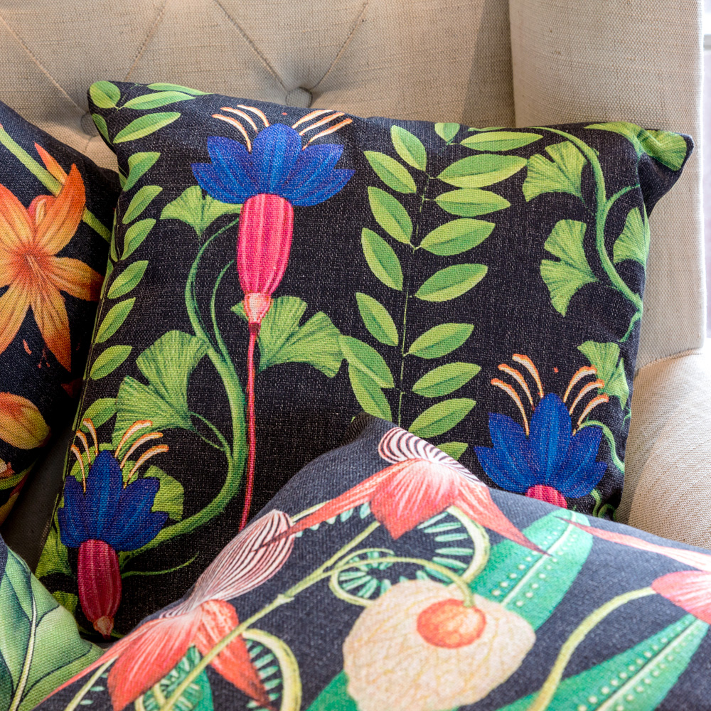 Круглогодичное цветение и пышная зелень даже осенью? Да, это возможно, если в Ваши интерьеры согреет дюжина мягких подушек с пышным хороводом тропических цветов.